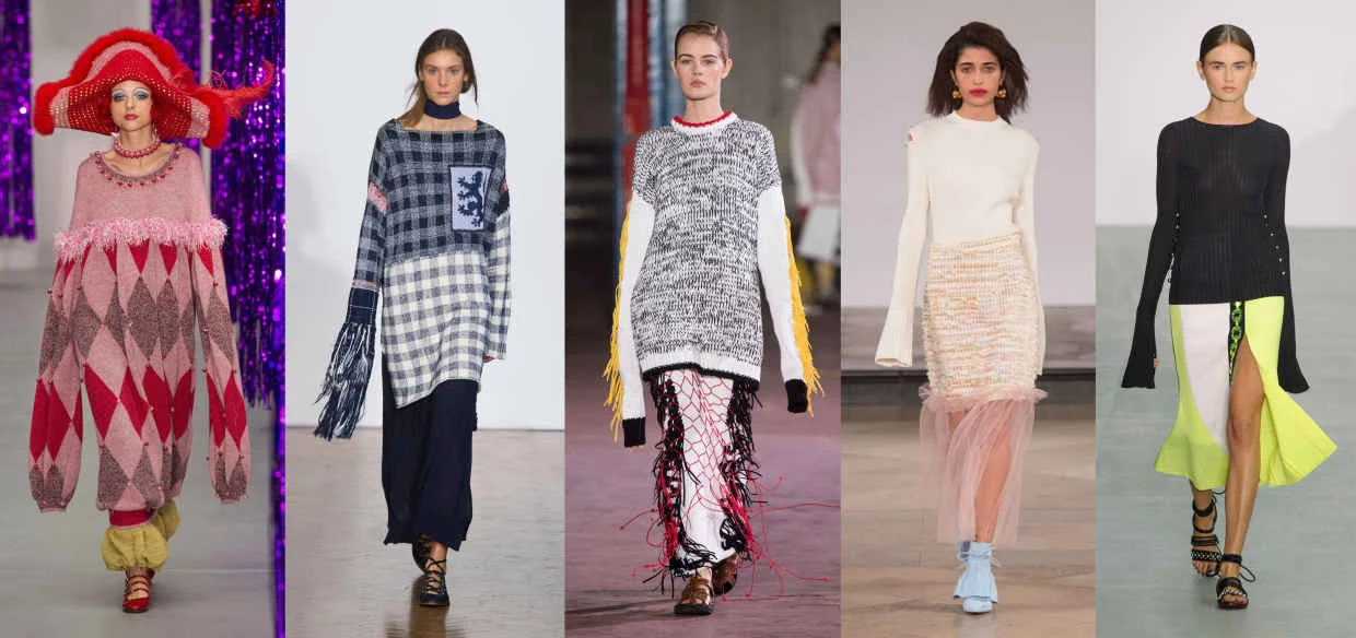Looks from L-R: Christopher Kane, Mary Katrantzou, House of Holland, Peter Pilotto and J.W. Anderson. Photos: Imaxtree