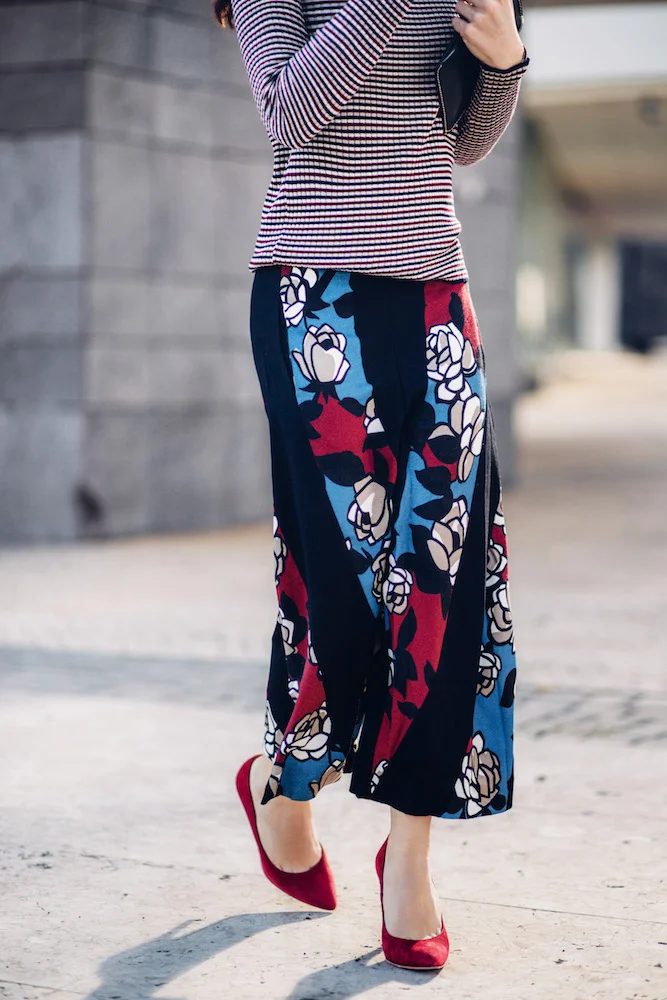 Striped Sweater: Massimo Dutti • Pattern Culottes: Sisley • Clutch: Mango (similar here and here) • Red Heels: Rebeca Sanver (similar here and here)