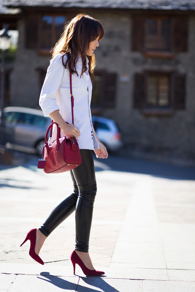 White Men's Shirt: Sacoor (similar here and here) • Leather Leggings: Helmut Lang • Red Handbag: DKNY (similar) • Red Heels: Rebeca Sanver (similar here and here)