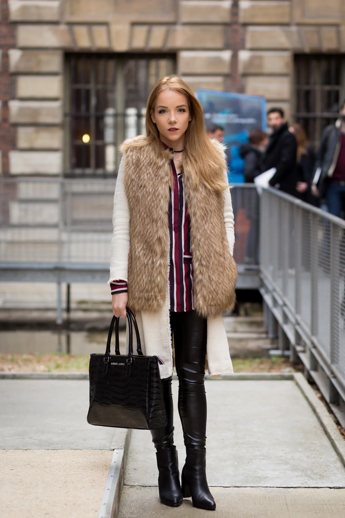 Deconstructed Coat: Zara (similar) • Striped Shirt: Asos • Black Handbag: Armani Jeans (similar) • Faux Fur Vest: Zara (similar) • Leather Leggings: Helmut Lang (similar) • Ankle Boots: Massimo Dutti (similar)