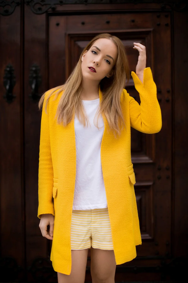 Yellow Coat: Zara (similar) • Cotton T-Shirt: Similar here and here • Striped Shorts: J.Crew • Laser Cut Heels: Missguided (similar)